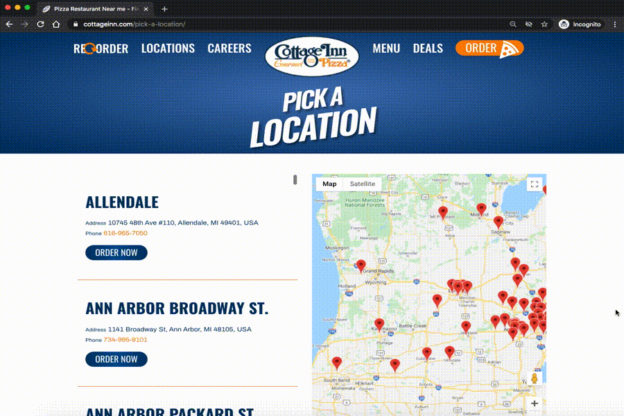 Let’s say that you want to make a list of all the Cottage Inn Pizza locations. When you go to their website, it turns out that there are a lot of locations.